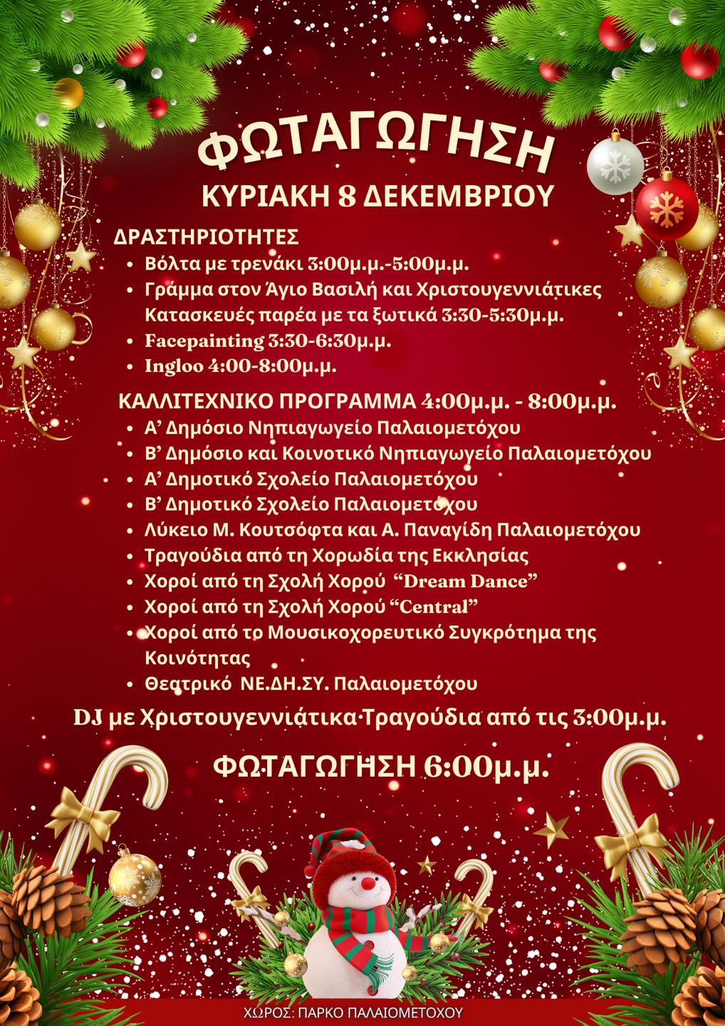 Η φωταγώγηση θα λάβει χώρα στο κεντρικό πάρκο και θα συνοδευτεί με πλείαδα εορταστικών εκδηλώσεων και δραστηριοτήτω, όπως βόλτα με τραινάκι, κατασκευές με ξωτικά, facepainting και πλούσιο καλλιτεχνικό πρόγραμμα, μεταξύ άλλων, χορούς από το μουσικοχορευτικό σύνολο της κοινότητας.