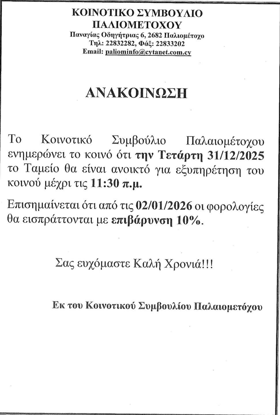 Αύριο Τετάρτη το ταμείο στο Κοινοτικό Συμβούλιο Παλιομετόχου κλείνει στις 11:30 π.μ.