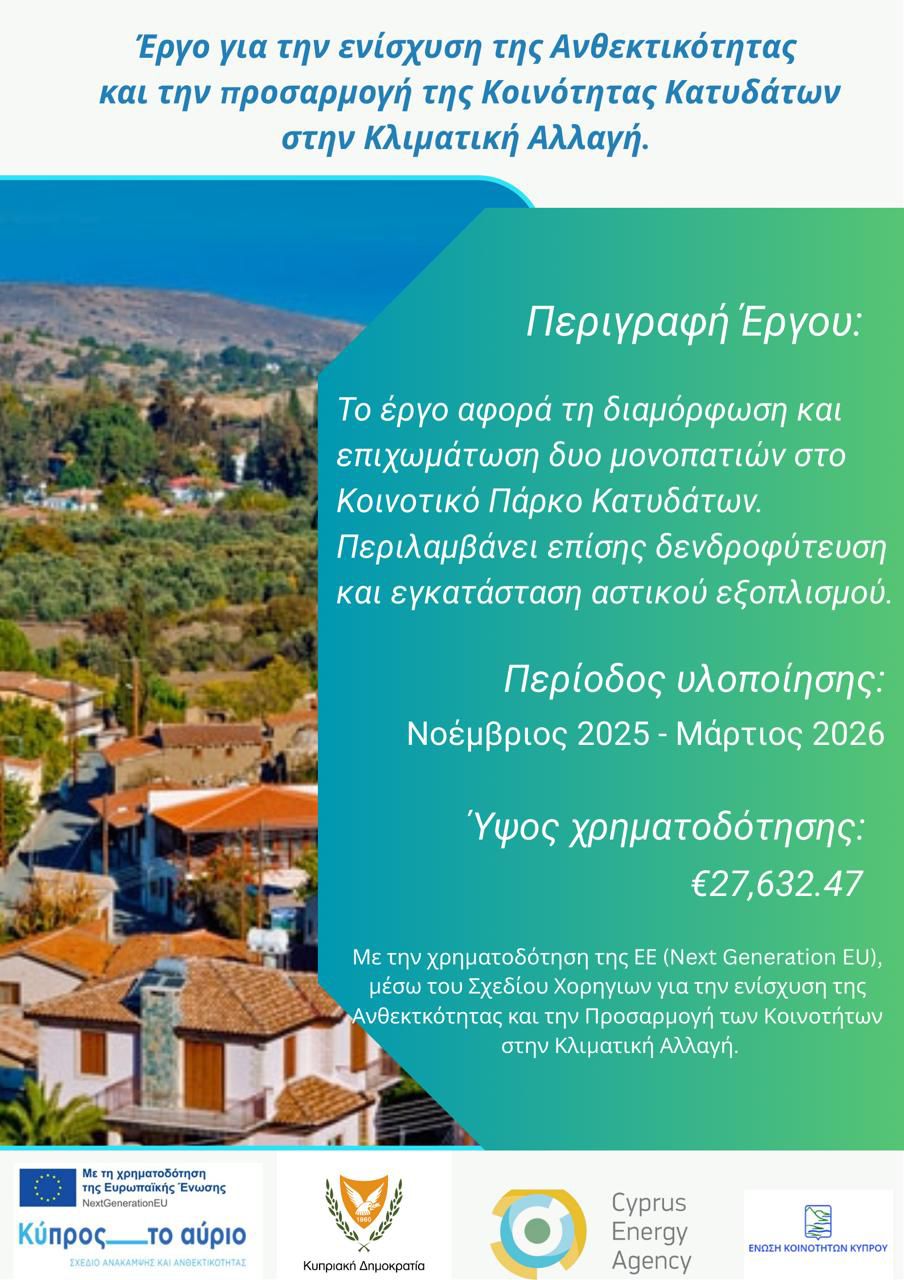 Θα βελτιώσει και θα αναβαθμίσει το κοινοτικό πάρκο, το Κοινοτικό Συμβούλιο Κατυδάτων, μέσα από το Σχέδιο Ανθεκτικότητας και ένα ποσό της τάξης των 27,632 ευρώ.
