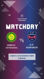 Εκτός έδρας αναμέτρηση με τον Ορφέα Λευκωσίας ακολουθεί για την ΑΕ Κοράκου το Σάββατο.
