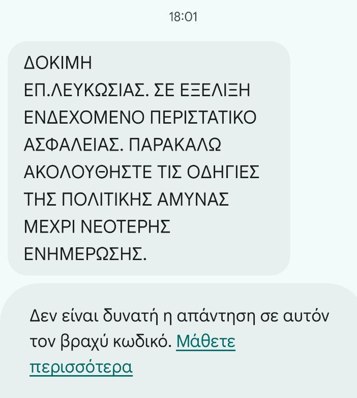 Μερίδα συμπολιτών μας σε Λευκωσία και Δυτική Λευκωσία έχει λάβει το εξής μήνυμα, το οποίο υπενθυμίζεται είναι δοκιμαστικό:
