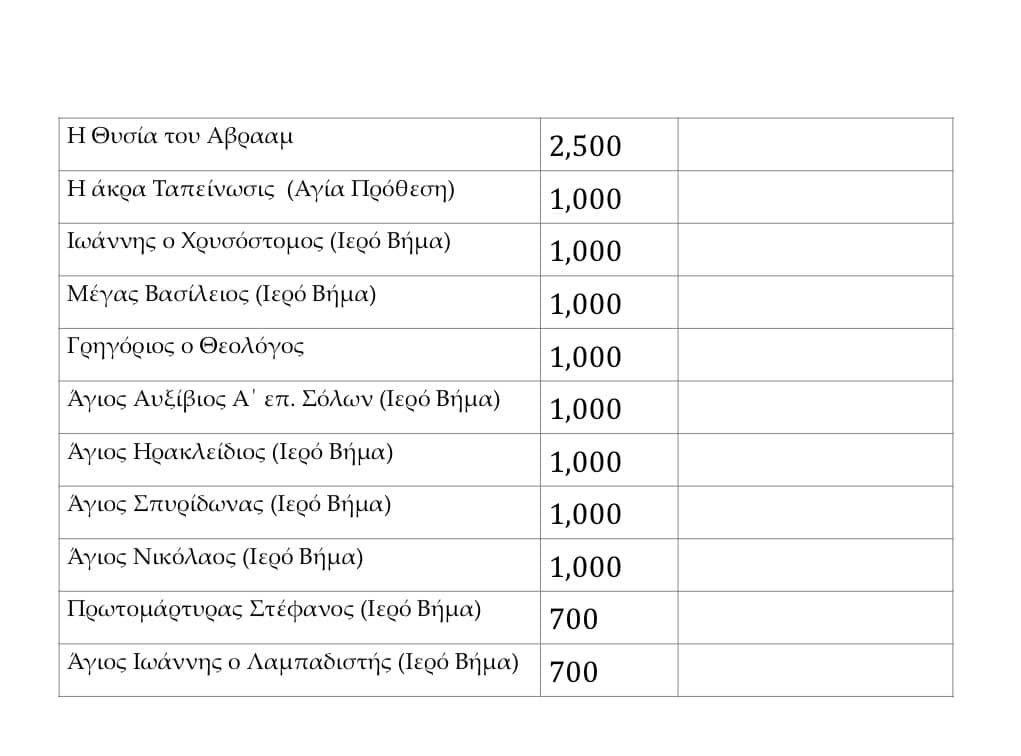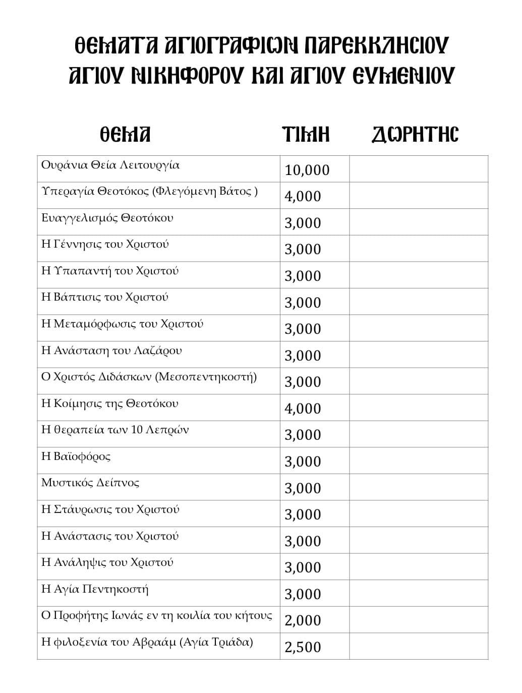Όσοι ενδιαφέρονται να αναλάβουν τα έξοδα κάποιας Αγιογραφίας είτε υπέρ υγείας ζώντων, είτε υπέρ αναπαύσεως κεκοιμημένων αδελφών μας, παρακαλούμε να επικοινωνήσουν μαζί μας, για να κρατήσουν έγκαιρα την παράσταση της επιλογής τους. Για τον σκοπό αυτό παραθέτουμε πιο κάτω αναλυτικό κατάλογο των παραστάσεων με τις αντίστοιχες τιμές για την κάθε μία. Για πληροφορίες και παραγγελίες, μπορείτε να επικοινωνείτε με τον π. Μιχαήλ Νικολάου (τηλ: 99527607). Για τις παραγγελίες θα τηρηθεί σειρά προτεραιότητας. Οι νεοφανείς και θαυματουργοί όσιοι μας να δίνουν σε όλους την Πίστη και την Υπομονή τους στον εν Χριστώ μας αγώνα, καταλήγει η ανακοίνωση.