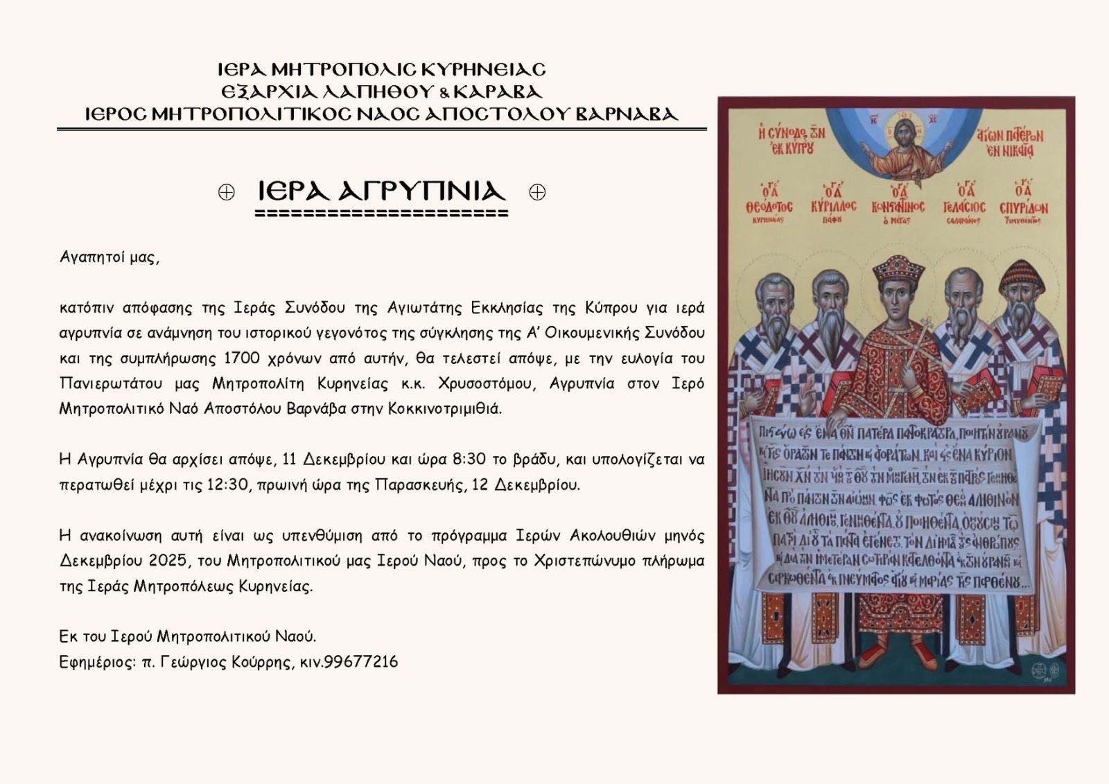 Αγρυπνία στον Ιερό Μητροπολιτικό Ναό Αποστόλου Βαρνάβα στην Κοκκινοτριμιθιά, θα τελεστεί σήμερα από την Ιερά Μητρόπολη Κυρηνείας.