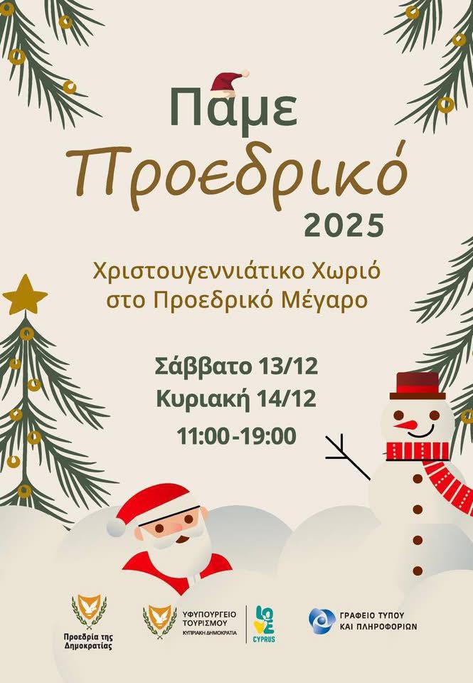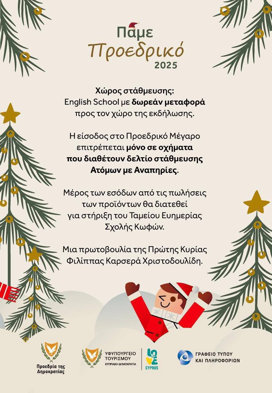 Σημειώνεται ότι στο Προεδρικό διοργανώνεται Χριστουγεννιάτικο Χωριό με πωλήσεις διαφόρων προϊόντων, ενώ μέρος των εσόδων θα δοθεί για φιλανθρωπικό σκοπό.