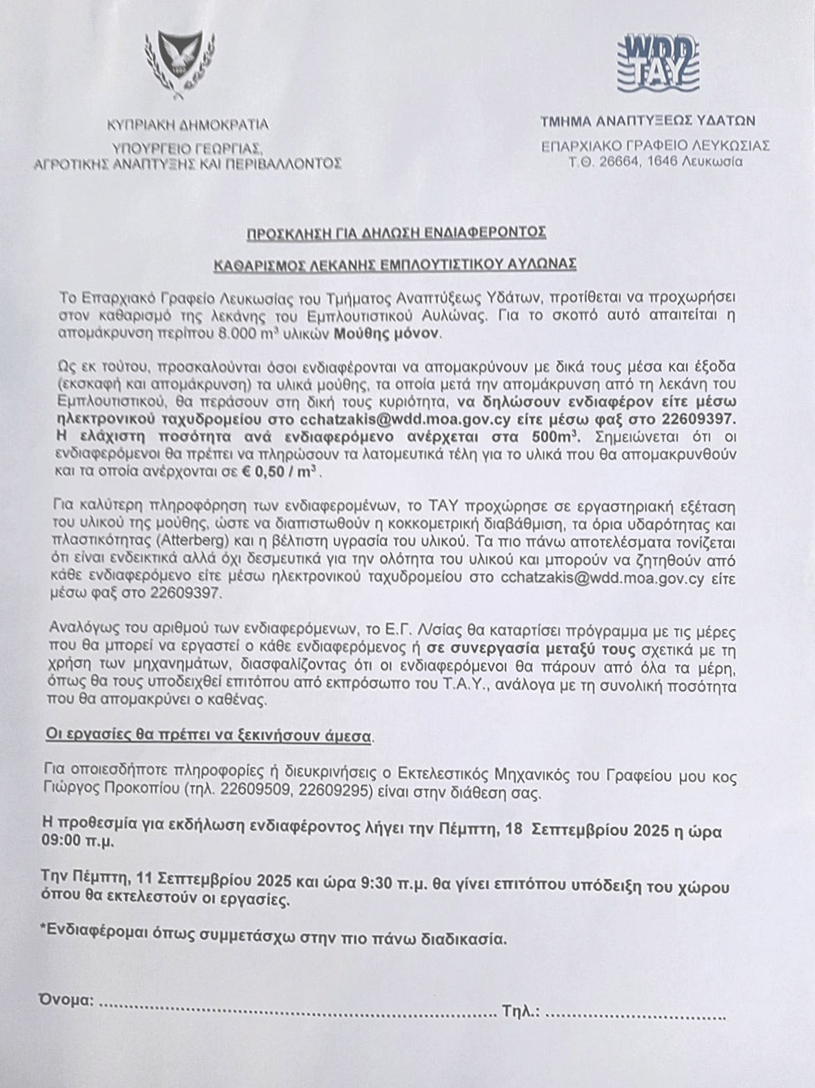 Ανακοίνωση για τον καθαρισμό της λεκάνης του Εμπλουτιστικού Αυλώνας September 10, 2025 ΑγροτοκτηνοτροφικάΕπικαιρότηταΔυτική ΛευκωσίαΚατεχόμενες ΚοινότητεςΤοπικά Ανακοίνωση για τον καθαρισμό της λεκάνης του Εμπλουτιστικού Αυλώνας, ανάρτησε το Κοινοτικό Συμβούλιο. Η προθεσμία για δήλωση ενδιαφέροντος λήγει την Πέμπτη, 18 Σεπτεμβρίου 2025 η ώρα 09:00 π.μ. Για περισσότερες πληροφορίες διαβάστε παρακάτω: ΗΜΕΡΟΛΟΓΙΟ ΕΚΔΗΛΩΣΕΩΝ ΤΕΛΕΥΤΑΙΕΣ ΕΝΗΜΕΡΩΣΕΙΣ Δύο συλλήψεις χθες το βράδυ ανά το Παγκύπριο – 46 καταγγελίες για οδήγηση υπό επήρεια αλκοόλης Αστυνομία Νέα ανάρτηση με αυτοσαρκασμό και χιούμορ από την “τελευταία” ΑΕΚ Κανναβιών & Αγίας Ειρήνης – Φωτογραφίες ΑΘΛΗΤΙΚΑ Έγιναν αρχαιολόγοι οι μικροί Πρόσκοποι του Παλιομετόχου – Δράση στην ελεύθερη Αμμόχωστο – Φωτογραφίες & Βίντεο Τοπικά ΣΧΕΤΙΚΑ ΑΡΘΡΑ Δύο συλλήψεις χθες το βράδυ ανά το Παγκύπριο – 46 καταγγελίες για οδήγηση υπό επήρεια αλκοόλης Αστυνομία Previous articleΜαρτυρίες κατοίκων της Δένειας για τη “γιάφκα” στο χωριό και τον αλλοδαπό εμπλεκόμενο – Επικουρικό ρόλο είχε η Αστυνομία ΚοκκινοτριμιθιάςNext articleΓια ακόμη μια μέρα υπάρχει πιθανότητα μεμονωμένων βροχών ή και καταιγίδων