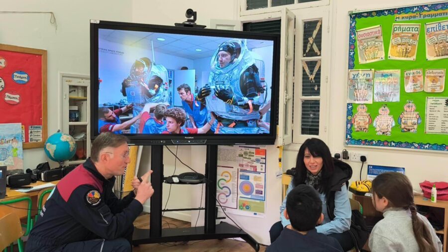 Όπως αναφέρει η δασκάλα του σχολείου Χριστιάνα Χριστοφόρου, τη Δευτέρα ένας αστροναύτης προσγειώθηκε στο σχολείο μας… κι από τότε πετάμε ανάμεσα στα αστέρια (με άγνωστο χρόνο επιστροφής πίσω στη Γη)!