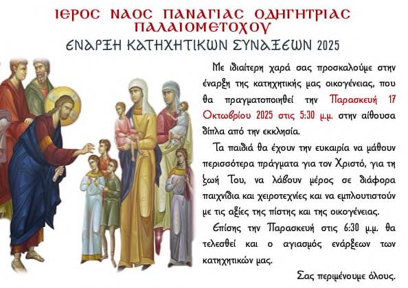 Αρχίζουν οι κατηχητικές συνάξεις στο Παλιομέτοχο – Όλες οι πληροφορίες October 15, 2025 ΕπικαιρότηταΔυτική ΛευκωσίαΠλησίον Πόλης - Ανατολική Μόρφου (ΣΤ’)ΤοπικάΕκκλησία Την Παρασκευή 17 Οκτωβρίου αρχίζουν οι κατηχητικές συνάξεις στον Ιερό Ναό Παναγίας Οδηγήτριας στο Παλιομέτοχο. Η ώρα 17:30 μ.μ το απόγευμα, στην αίθουσα δίπλα από την Εκκλησία. Για περισσότερες πληροφορίες διαβάστε παρακάτω: ΗΜΕΡΟΛΟΓΙΟ ΕΚΔΗΛΩΣΕΩΝ ΤΕΛΕΥΤΑΙΕΣ ΕΝΗΜΕΡΩΣΕΙΣ Συνεστίαση οργανώνουν οι πρόσφυγες από το Καπούτι – Στην περιοχή της Ασίνου Κατεχόμενες Κοινότητες Πήγαν οι γιαγιάδες και έφτιαξαν πουρέκια στο Β’ Δημοτικό Κοκκινοτριμιθιάς – Φωτογραφίες Κοινωνία Αυξημένες οι συλλήψεις παγκύπρια χθες το βράδυ στις περιπολίες της Αστυνομίας Αστυνομία ΣΧΕΤΙΚΑ ΑΡΘΡΑ Συννεφιασμένος ο καιρός σήμερα – Το δελτίο καιρού για τις επόμενες ημέρες Κύπρος Πως έφθασε στον εντοπισμό των ναρκωτικών και των εκρηκτικών μηχανισμών η ΥΚΑΝ Επικαιρότητα Αυξημένες οι συλλήψεις παγκύπρια χθες το βράδυ στις περιπολίες της Αστυνομίας Αστυνομία Previous articleΚακόβουλα φαίνεται να τέθηκε φωτιά σε οικία χθες στη ΛευκωσίαNext articleΚάλεσμα Συνδέσμου Γονέων Α’ Δημοτικού Κοκκινοτριμιθιάς σε φεστιβάλ ανακύκλωσης – Ανακύκλωση τιγανοκίνησης και στο σχολείο