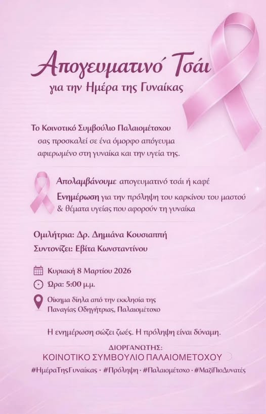 Απογευματικό Τσάι για την Ημέρα της Γυναίκας διοργανώνει το Κοινοτικό Συμβούλιο Παλιομετόχου.