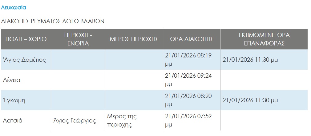 Διακοπή ρεύματος σε χωριό της Δυτικής Λευκωσίας και σε περιοχές της πρωτεύουσας January 21, 2026 ΕπικαιρότηταΔυτική ΛευκωσίαΤοπικά Διακοπή ρεύματος αναφέρθηκε από αναγνώστες στην Εφημερίδα Δυτικής Λευκωσίας, τόσο στη Δένεια, όσο και σε άλλες περιοχές του αστικού ιστού της Λευκωσίας. Σύμφωνα με ενημέρωση από την ΑΗΚ, η βλάβη αναμένεται να επιδιορθωεί λίγο πριν τα μεσάνυχτα. ΗΜΕΡΟΛΟΓΙΟ ΕΚΔΗΛΩΣΕΩΝ ΤΕΛΕΥΤΑΙΕΣ ΕΝΗΜΕΡΩΣΕΙΣ Δύο συλλήψεις χθες το βράδυ ανά το Παγκύπριο – 46 καταγγελίες για οδήγηση υπό επήρεια αλκοόλης Αστυνομία Νέα ανάρτηση με αυτοσαρκασμό και χιούμορ από την “τελευταία” ΑΕΚ Κανναβιών & Αγίας Ειρήνης – Φωτογραφίες ΑΘΛΗΤΙΚΑ Έγιναν αρχαιολόγοι οι μικροί Πρόσκοποι του Παλιομετόχου – Δράση στην ελεύθερη Αμμόχωστο – Φωτογραφίες & Βίντεο Τοπικά ΣΧΕΤΙΚΑ ΑΡΘΡΑ Δύο συλλήψεις χθες το βράδυ ανά το Παγκύπριο – 46 καταγγελίες για οδήγηση υπό επήρεια αλκοόλης Αστυνομία Previous articleΕνδιαφέρει αγρότες: Διαφορετικές οι προσεγγίσεις των Κύπριων Ευρωβουλευτών για συμφωνίες ΕΕ-MercosurNext articleΔύο συλλήψεις στη Λευκωσία χθες το βράδυ κατά τους ελέγχους της Αστυνομίας