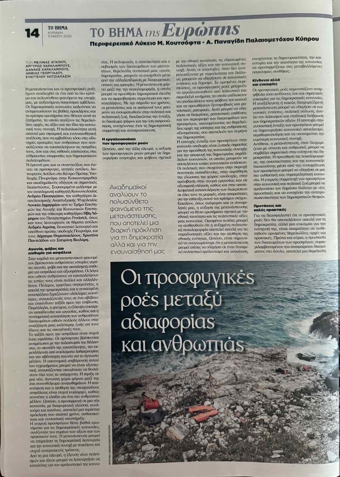 Ανάμεσα στα άρθρα που δημοσιεύτηκαν είναι και αυτό των μαθητών/ριών μας, Μελίνας Αγαπίου Α21, Αργυρώς Χαραλάμπους Β31, Δανάης Χαραλάμπους Β31, Άνθιας Γεωργιάδου Β1_2 και Ευάγγελου Κοτζιάπασιη Β31. Το άρθρο πραγματεύεται τη μετανάστευση και τις προσφυγικές ροές ως ένα κρίσιμο παγκόσμιο ζήτημα που επηρεάζει τις δημοκρατικές κοινωνίες. Το άρθρο είναι αποτέλεσμα έρευνας και συνεντεύξεων που έκαναν οι μαθητές/ριες σε ακαδημαϊκούς, λειτουργούς του Κέντρου Πρώτης Υποδοχής «Πουρνάρα» και σε μετανάστες.