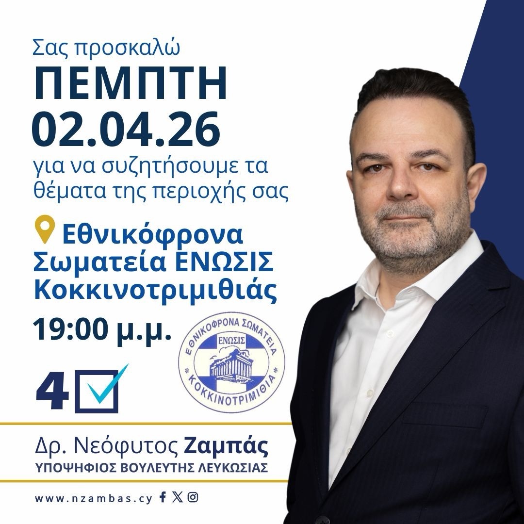Στα Εθνικόφρονα Σωματεία Ένωσις Κοκκινοτριμιθιάς θα βρεθεί την Πέμπτη 2 Απριλίου ο υποψήφιος βουλευτής του ΔΗΣΥ Νεόφυτος Ζαμπάς.