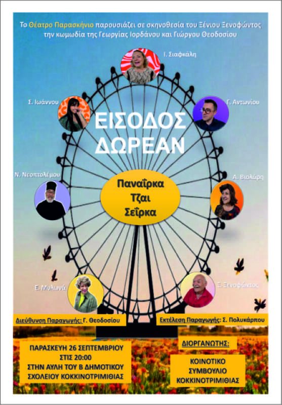Δωρεάν θεατρική παράσταση στην Κοκκινοτριμιθιά – Όλες οι πληροφορίες September 25, 2025 ΕπικαιρότηταΔυτική ΛευκωσίαΠολιτισμόςΕκδηλώσειςΤοπικάΚοινωνία Την Παρασκευή 26 Σεπτεμβρίου στις 20:00, το Κοινοτικό Συμβούλιο Κοκκινοτριμιθιάς προσφέρει δωρεάν την κωμωδία Παναϊρκα τζαι Σεϊρκα. Στην αυλή του B’ Δημοτικού Σχολείου Κοκκινοτριμιθιά, μια παράσταση της Γεωργίας Ιροδάνου και του Γιώργου Θεοδοσίου. ΗΜΕΡΟΛΟΓΙΟ ΕΚΔΗΛΩΣΕΩΝ ΤΕΛΕΥΤΑΙΕΣ ΕΝΗΜΕΡΩΣΕΙΣ Δήμαρχος Μόρφου: Το δικαίωμα στην ιδιοκτησία και την επιστροφή τείνει να γίνει θεωρητικό – Αναφορά στον αυτοκινητόδρομο Κατεχόμενες Κοινότητες Θα δει τους κοινοτάρχες της Μόρφου την ερχόμενη βδομάδα, είπε ο Πρόεδρος για το δρόμο κατά την έλευσή του στην αντικατοχική του Δήμου Ανάπτυξη ΕΚΤΑΚΤΟ: Δύο θανατηφόρα τροχαία σε χωριά της νότιας Λευκωσίας – Όλες οι πληροφορίες Αστυνομία ΣΧΕΤΙΚΑ ΑΡΘΡΑ Previous article12ο Επαρχιακό Σκοπευτικό Πρωτάθλημα Κυνηγετικών Συλλόγων ΛευκωσίαςNext articleΕυρωπαϊκή Ημέρα Γλωσσών στο Γυμνάσιο Λύκειο Κάτω Πύργου Τηλλυρίας – Φωτογραφίες