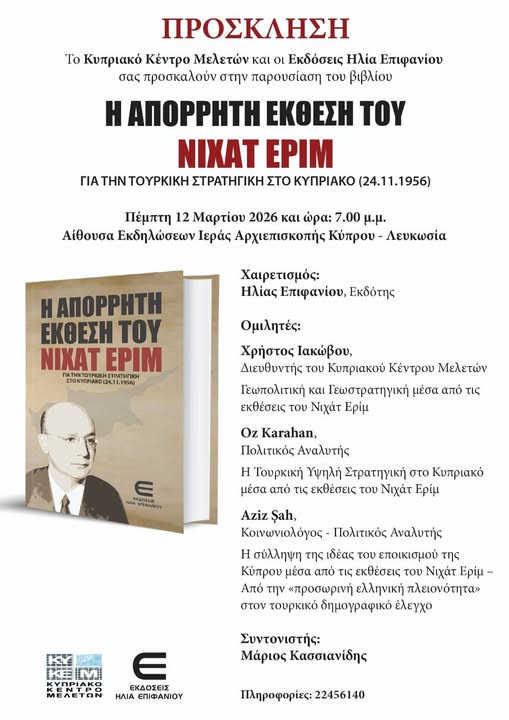 Την Πέμπτη 12 Μαρτίου στις 19:00 συμμετέχω ως ομιλητής στην παρουσίαση του βιβλίου «Η Απόρρητη Έκθεση του Νιχάτ Ερίμ για την Τουρκική Στρατηγική στο Κυπριακό (24.11.1956)», αναφέρει με ανακοίνωσή του ο Οζ Καραχάν, υποψήφιος βουλευτής Λευκωσίας με το Κίνημα Οικολόγων – Συνεργασία Πολιτών.