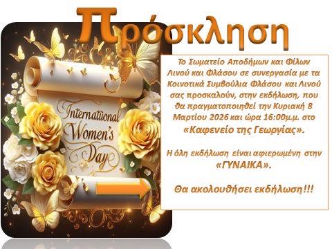 Μια μέρα ξεχωριστή για όλες τις Γυναίκες, διοργανώνει το Σωματείο Αποδήμων και φίλων Λινού-Φλάσου, σε συνεργασία με τα Κοινοτικό Συμβούλιο Λινούς και Φλάσου.