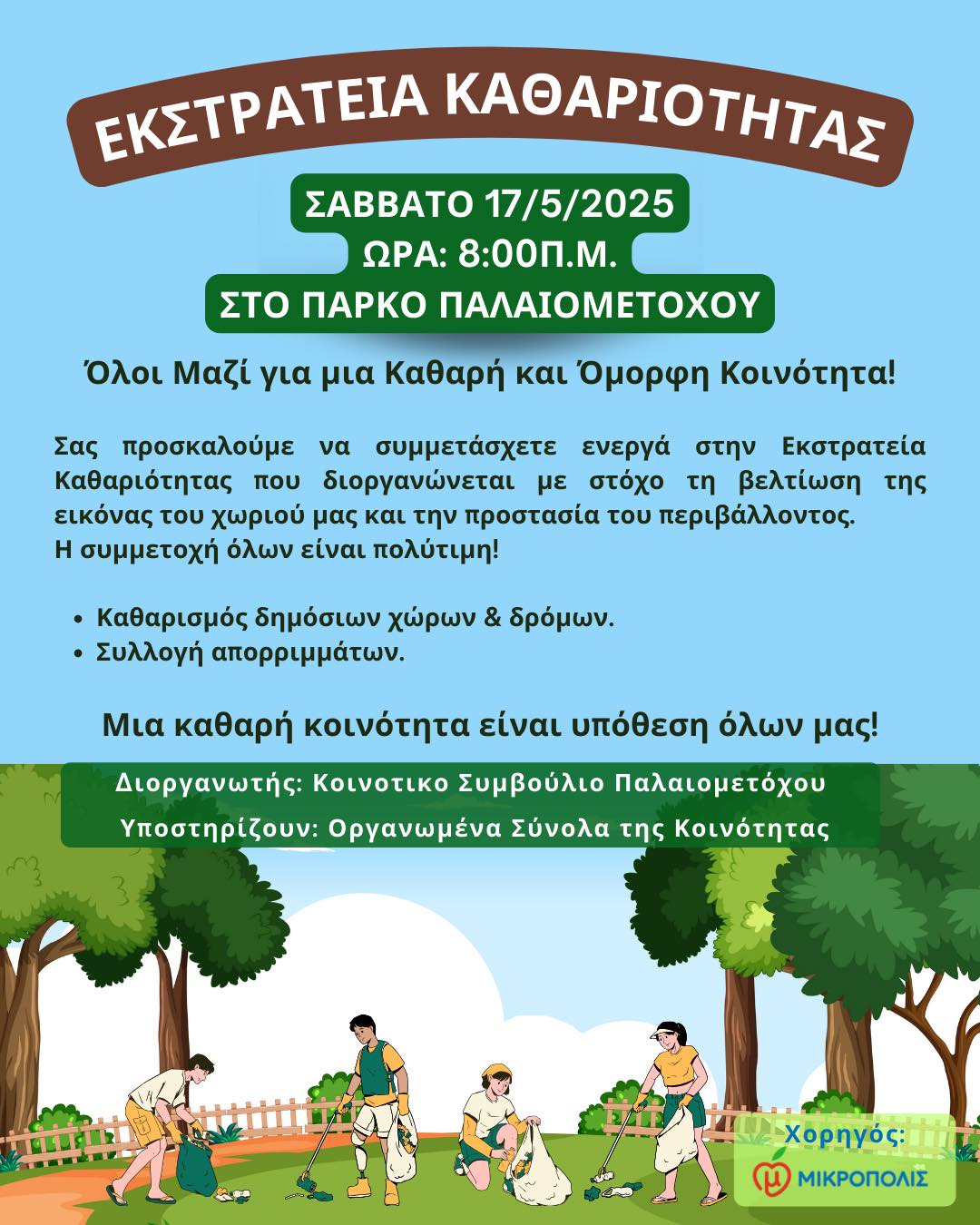 Το Κοινοτικό Συμβούλιο Παλιομετόχου διοργανώνει εκστρατεία καθαριότητας το Σάββατο 17 Μαΐου 2025, με ώρα έναρξης τις 8:00 το πρωί, στο Πάρκο Παλιομετόχου.