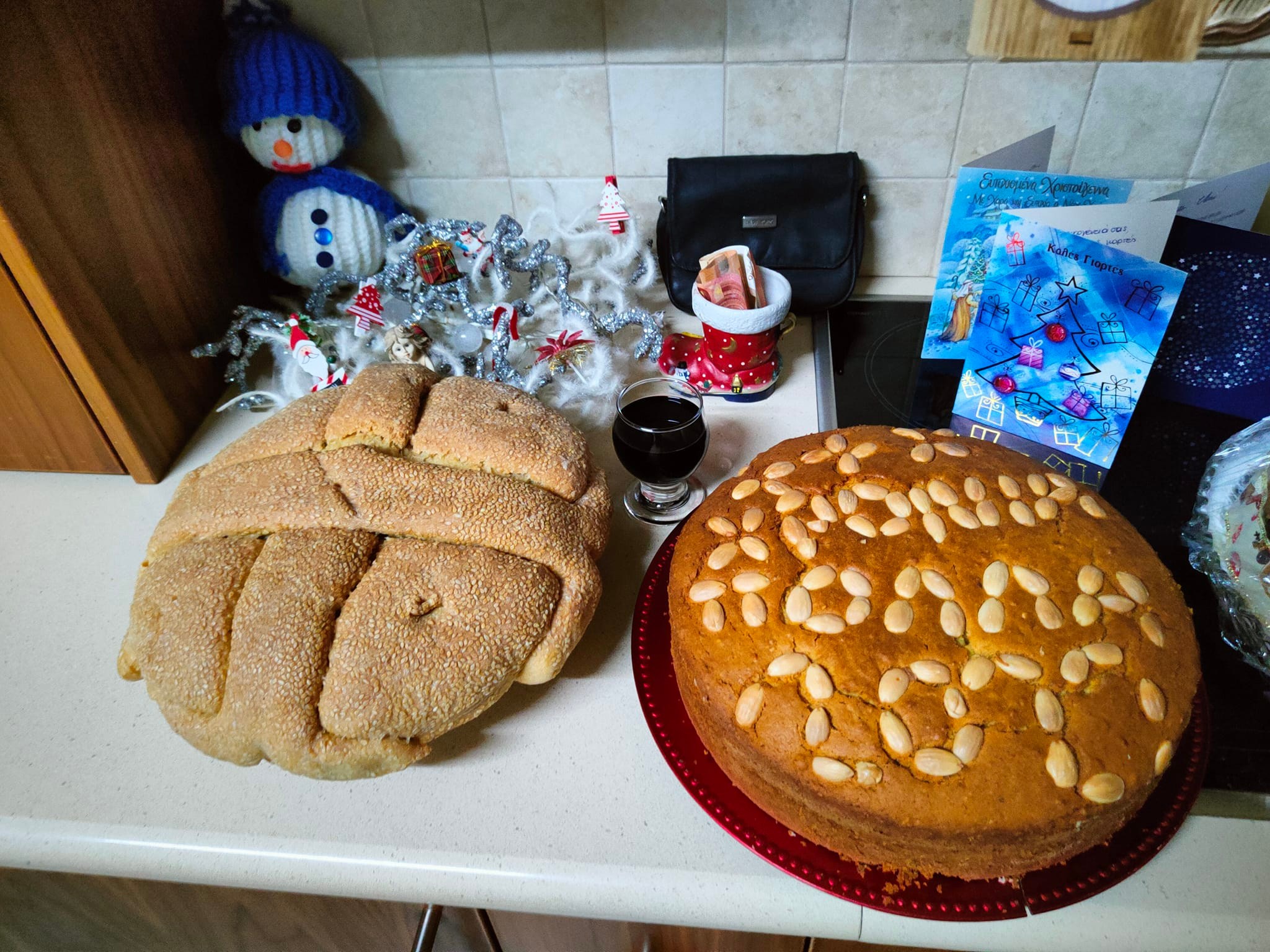 Το σισαμένο ψωμί Άης Βασίλης με το νόμισμα μέσα για τον τυχερό….. Ένα πιάτο κόλλυβα… Ένα ποτήρι κρασί για την πινιά του Άη Βασίλη και το πορτοφόλι για την πουλουστρίνα (χρηματικό ποσό ) που θα άφηνε ο Άης Βασίλης στους ενοίκους του σπιτιού.