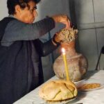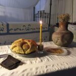 Ένα αναμμένο κερί, την Κούζα γεμάτη νερό και πάνω στο στόμιο μια ρίζα από θρουμπί.