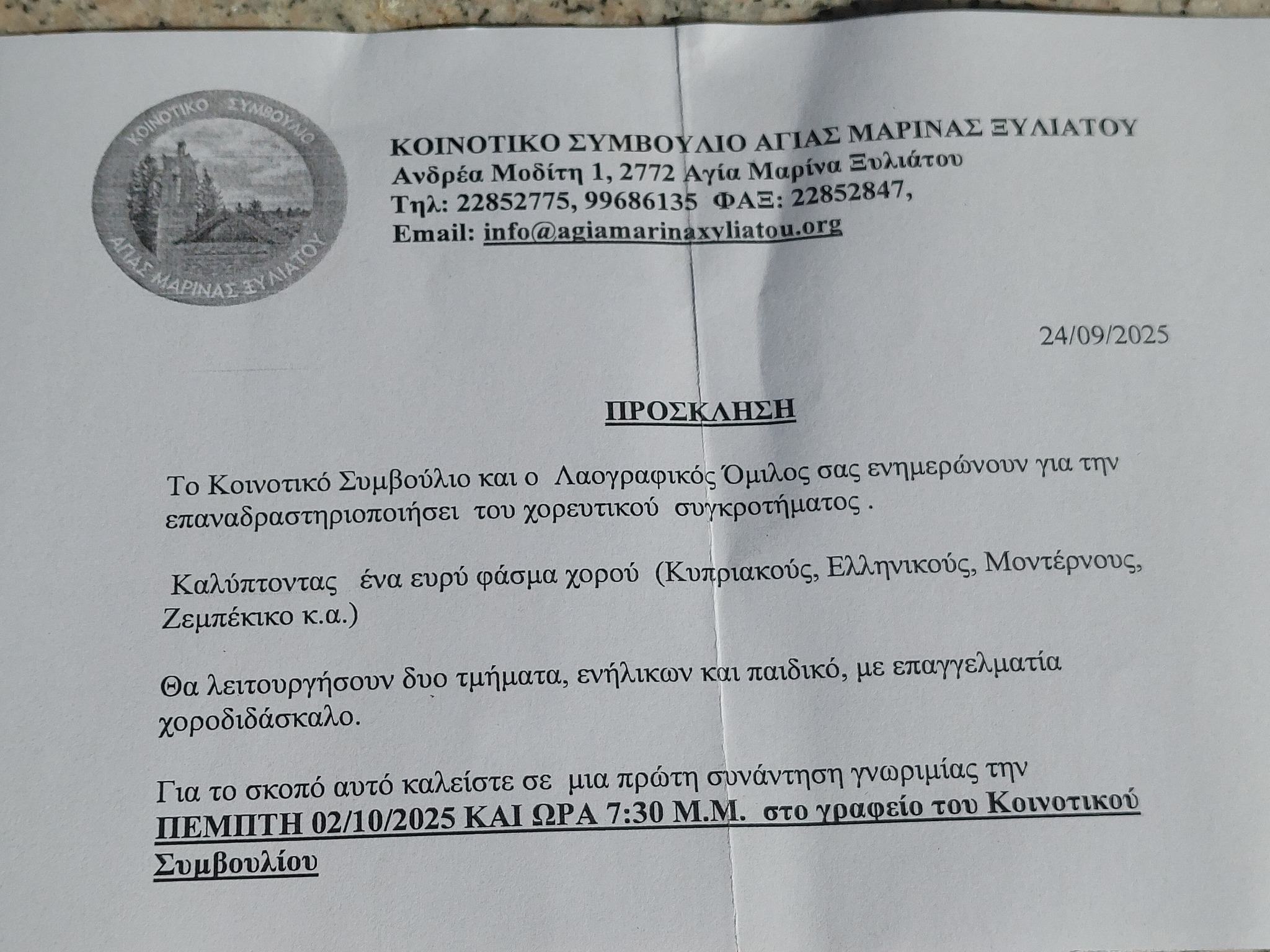 Επαναδραστηριοποιείται το χορευτικό συγκρότημα της Αγίας Μαρίνας Ξυλιάτου.