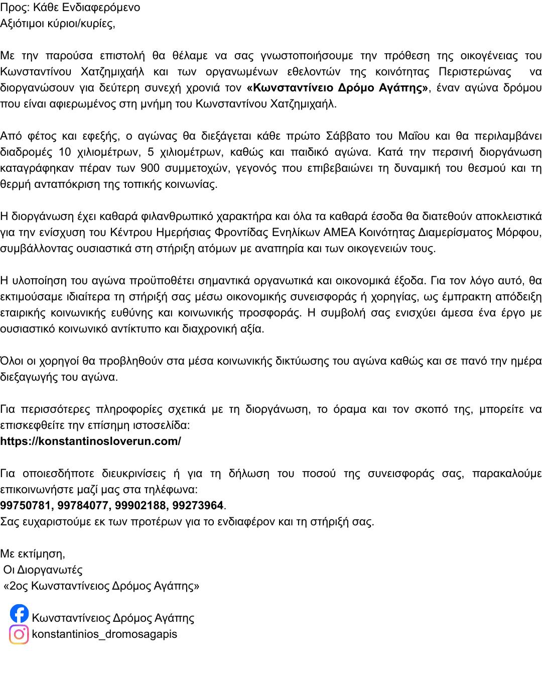 Επιστολή Κωνσταντίνειου Δρόμου Αγάπης για χορηγούς – “Χωρίς εσάς τίποτα δεν είναι εφικτό”