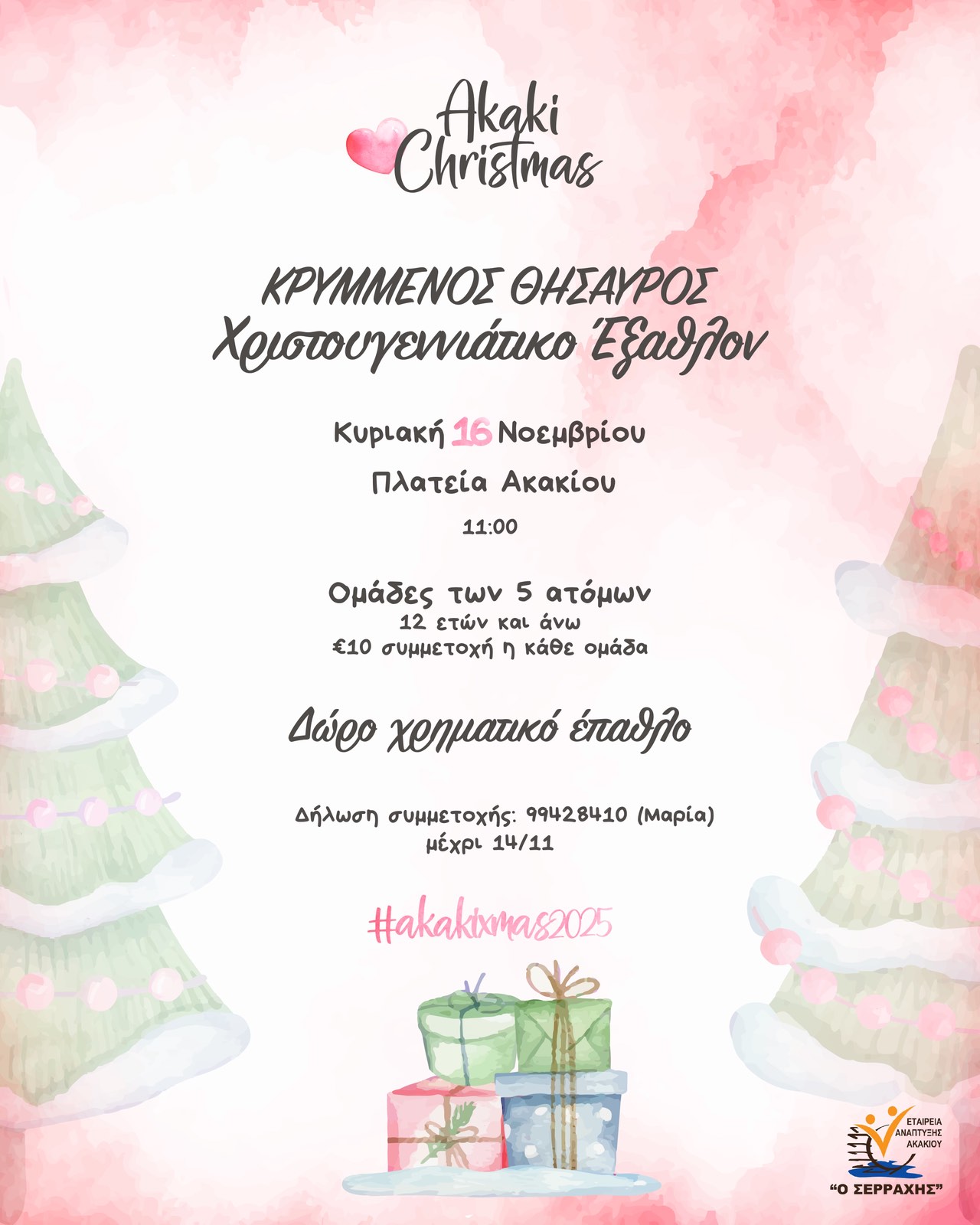 Ενόψει της εορταστικής περιόδου των Χριστουγέννων, αγαπημένη χριστουγεννιάτικη περίοδο μικρών και μεγάλων, η Εταιρεία Αναπτύξεως Ακακίου «Ο ΣΕΡΡΑΧΗΣ» έχει ετοιμάσει μια ιδιαίτερα όμορφη και ζεστή ατμόσφαιρα, με πλούσιες δράσεις και εκπλήξεις την Κυριακή 16 Νοεμβρίου 2025!