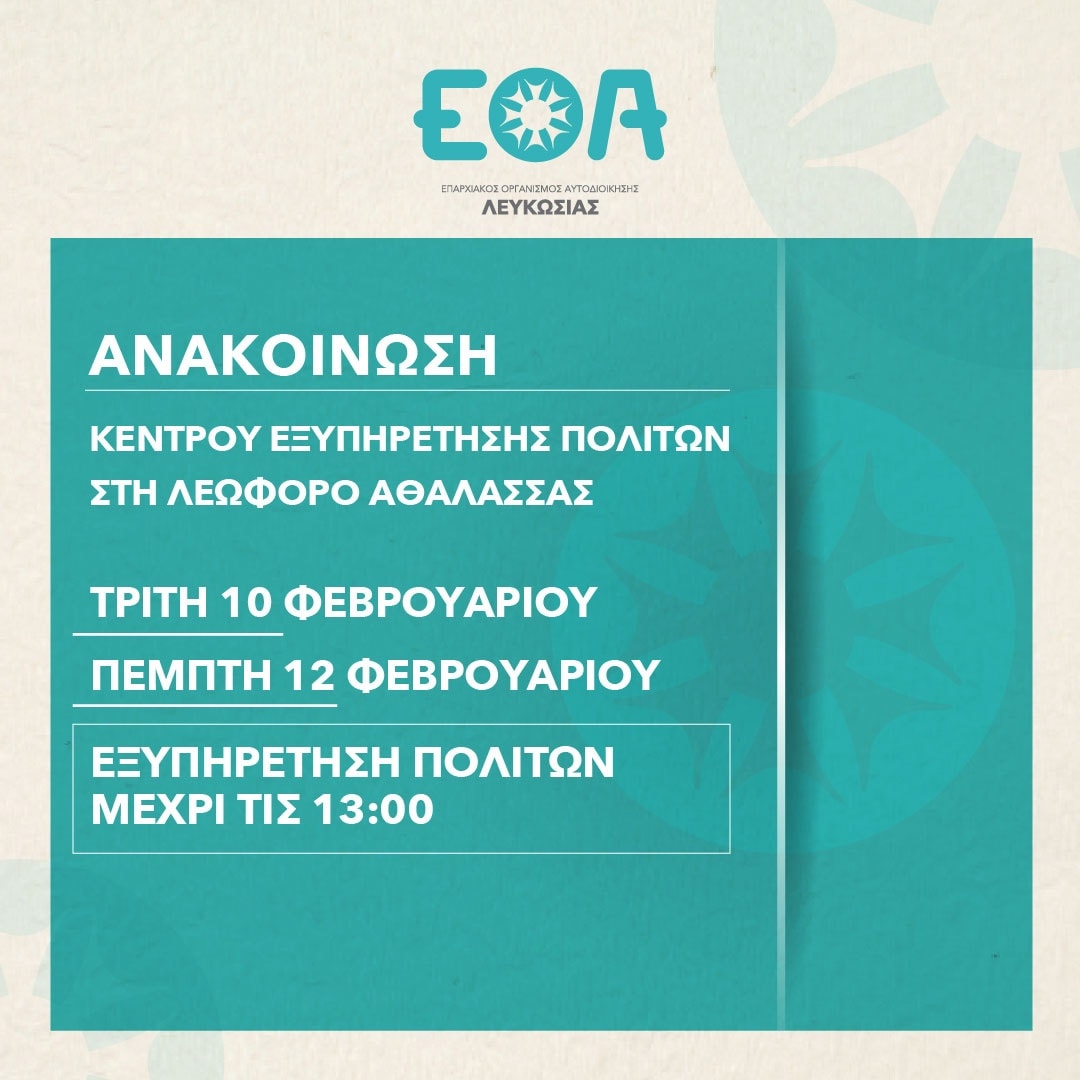 Μέχρι τη μία εξυπηρετούν τα Κέντρα Εξυπηρέτησης του ΕΟΑ Λευκωσίας στη Λεωφόρο Αθαλάσσας, για σήμερα Τρίτη και Πέμπτη 12 Φεβρουαρίου.