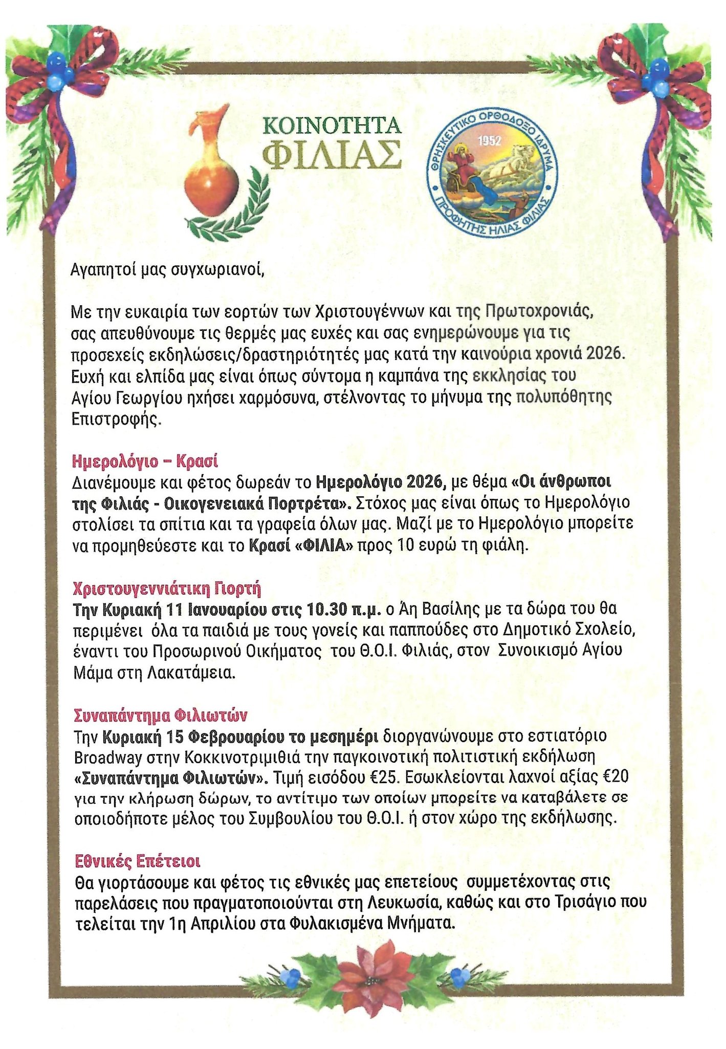 Όπως αναφέρεται από τον Κοινοτάρχη Ανδρέα Μιχαήλ, “θα αποσταλεί σε όλους τους χωριανούς οι οποίοι είναι εγγεγραμμενοι στο μητρώο της Κοινότητας και του Θ.Ο.Ι. Φιλιάς μαζί με την χριστουγεννιάτική κάρτα και τους λαχνούς για την ετήσια συνεστίαση”.