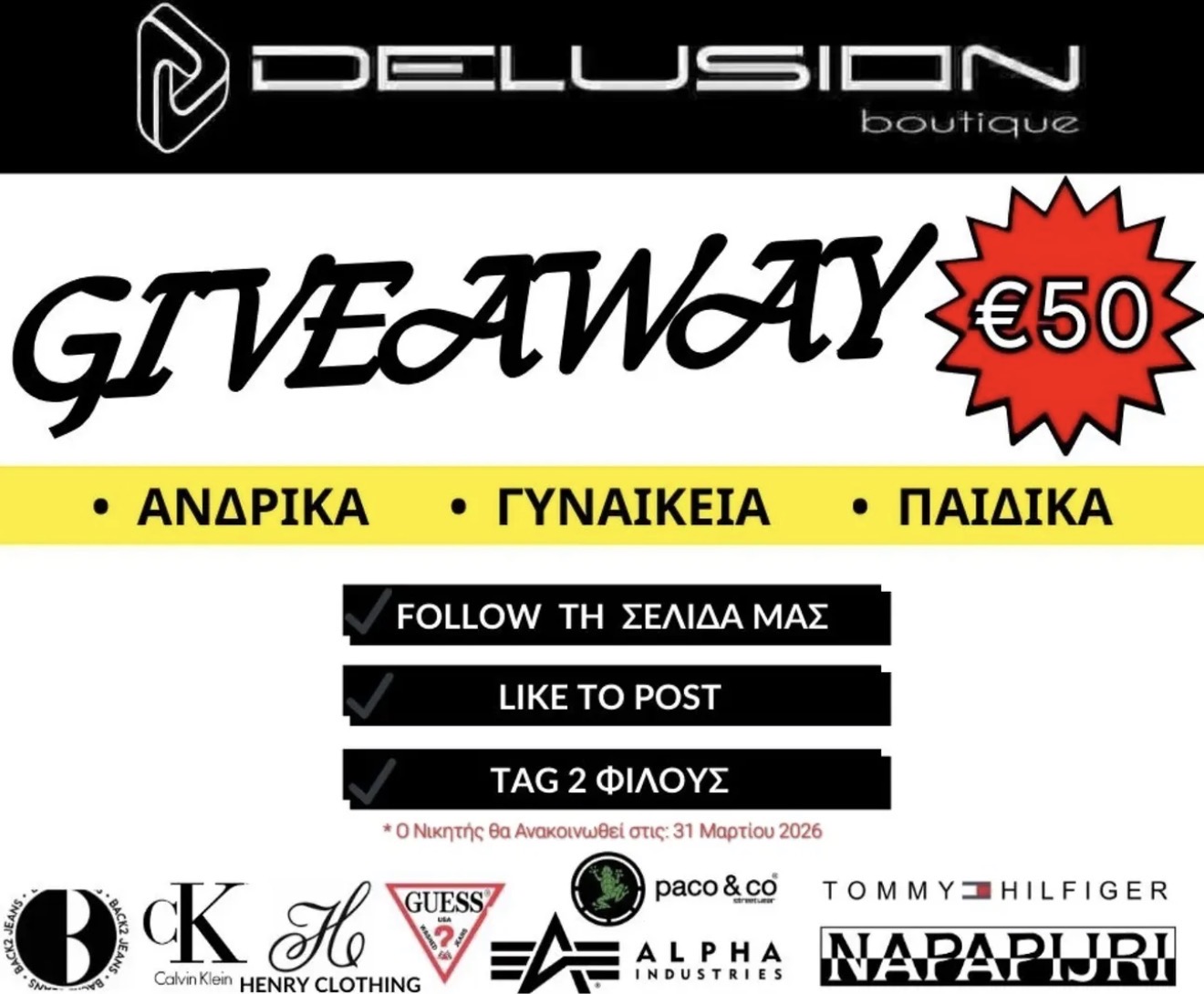 To Delusion Boutique προσκαλεί το κοινό να συμμετάσχει μέσω Instagram και Facebook κάνοντας follow, like στο σχετικό post και tag δύο φίλων μαζί με τη λέξη “delusion”, με κάθε σχόλιο να μετρά ως ξεχωριστή συμμετοχή και τον νικητή να ανακοινώνεται στις 31 Μαρτίου.