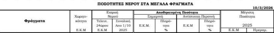 Η εισροή νερού στα φράγματα έχει μειωθεί αισθητά τις τελευταίες ημέρες, καθώς κατά τις πρώτες ημέρες του Μαρτίου δεν σημειώθηκαν ουσιαστικές βροχοπτώσεις. Όπως επεσήμανε, η ενίσχυση των αποθεμάτων νερού δεν εξαρτάται μόνο από το συνολικό ύψος βροχόπτωσης, αλλά και από τη γεωγραφική κατανομή της.