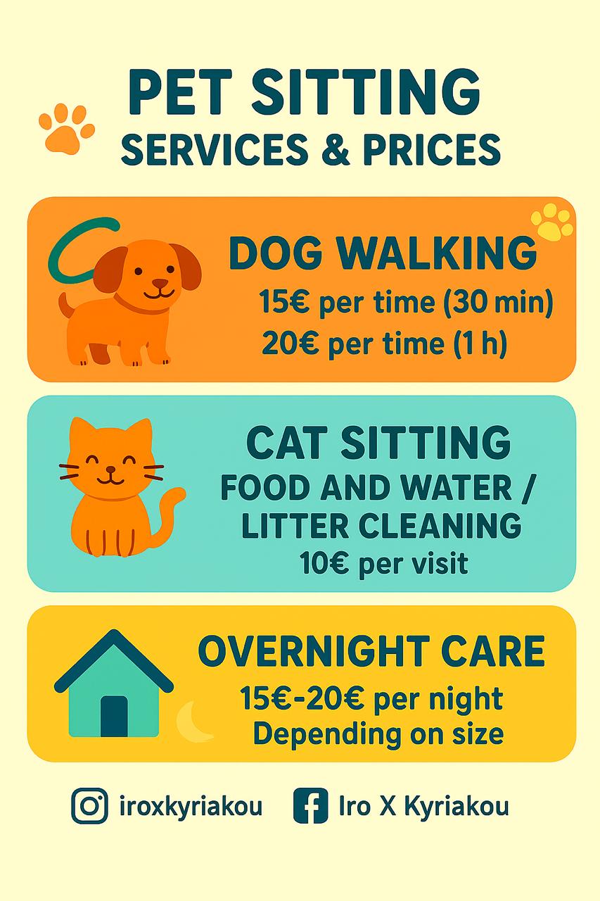 Μπορείς να επικοινωνήσεις με την Ηρώ, η οποία προσφέρει διάφορες υπηρεσίες pet sitting προσαρμοσμένες στις ανάγκες σου!
