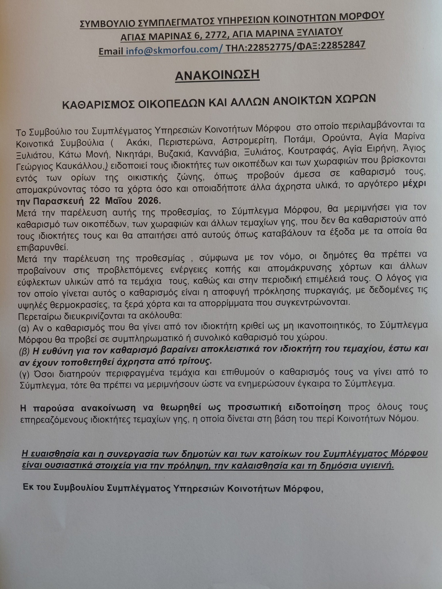 Ανακοίνωση εξέδωσε το Συμβούλιο Συμπλέγματος Υπηρεσιών Κοινοτήτων Μόρφου σχετικά με τον καθαρισμό οικοπέδων και χωραφιών που βρίσκονται εντός των ορίων της οικιστικής ζώνης.