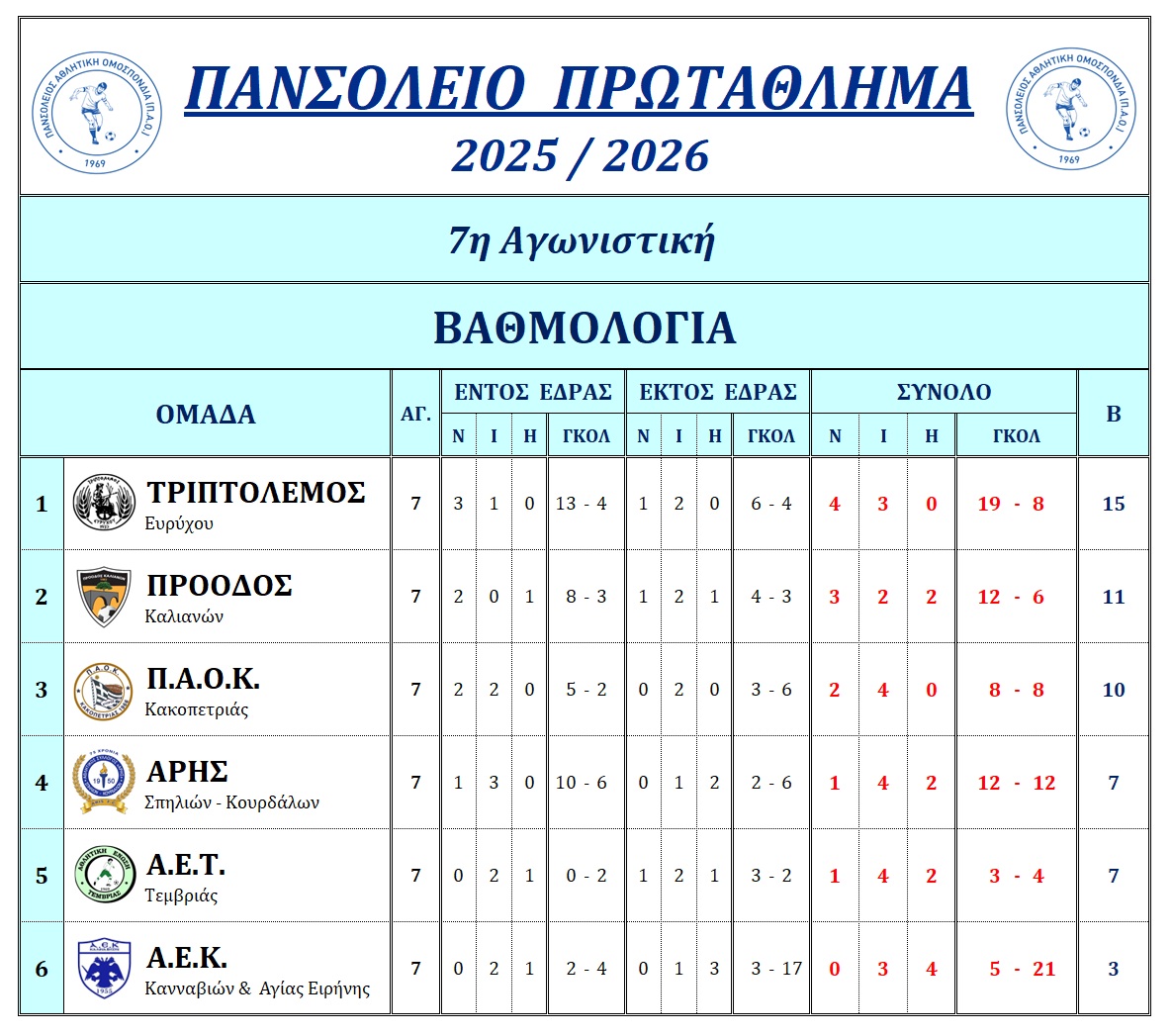 Το τελικό αποτέλεσμα του χθεσινού και τελευταίου αγώνα του Πανσολείου, με τον οποίο ολοκληρώθηκε η 7η αγωνιστική, ήταν 0 – 0 μεταξύ Α.Ε.Τ. Τεμβριάς και ΠΡΟΟΔΟΥ Καλιανών, ενώ, η ομάδα του Άρη Σπηλιών θεωρεί ότι την αδικεί η ήττα με 4 -2 από τον Τριπτόλεμου Ευρύχου.