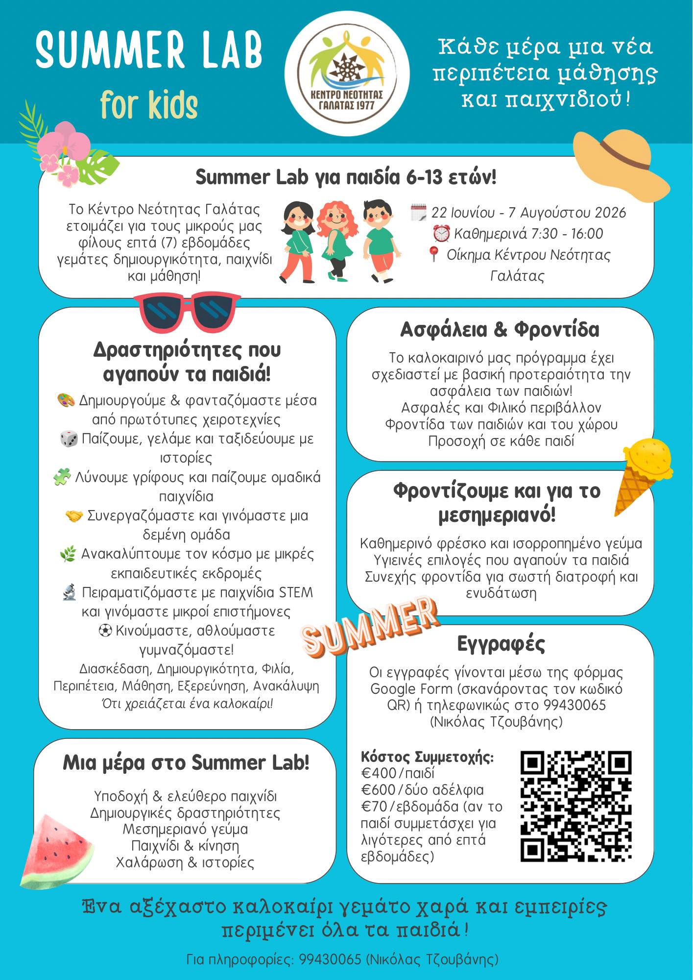 Summer Lab για παιδιά 6-13 ετών! Το Κέντρο Νεότητας Γαλάτας ετοιμάζει για τους μικρούς μας φίλους επτά (7) εβδομάδες γεμάτες δημιουργικότητα, παιχνίδι και μάθηση! Yπάρχουν ακόμη διαθέσιμες θέσεις!