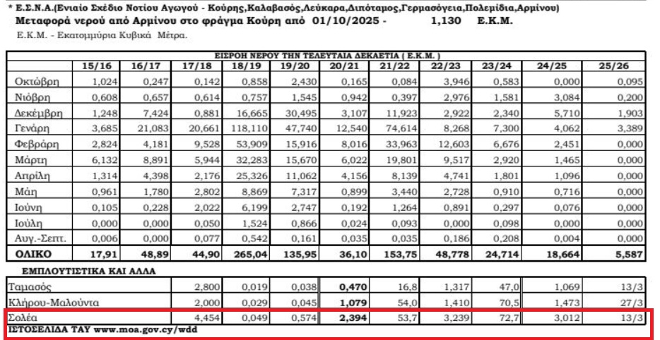 Τέλος, σε ό,τι αφορά το εμπλουτιστικό φράγμα Σολέας, η πληρότηα είναι 53,7%, ενώ πέρσυ ήταν 72,7%.