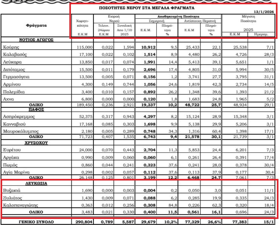 Καλά φαίνονται να είναι τα δεδομένα για το Φράγμα Καλοπαναγιώτη και Σολέας, ωστόσο, για το Φράγμα Βυζακιάς και Ξυλιάτου η κατάσταση παραμένει δραματική.