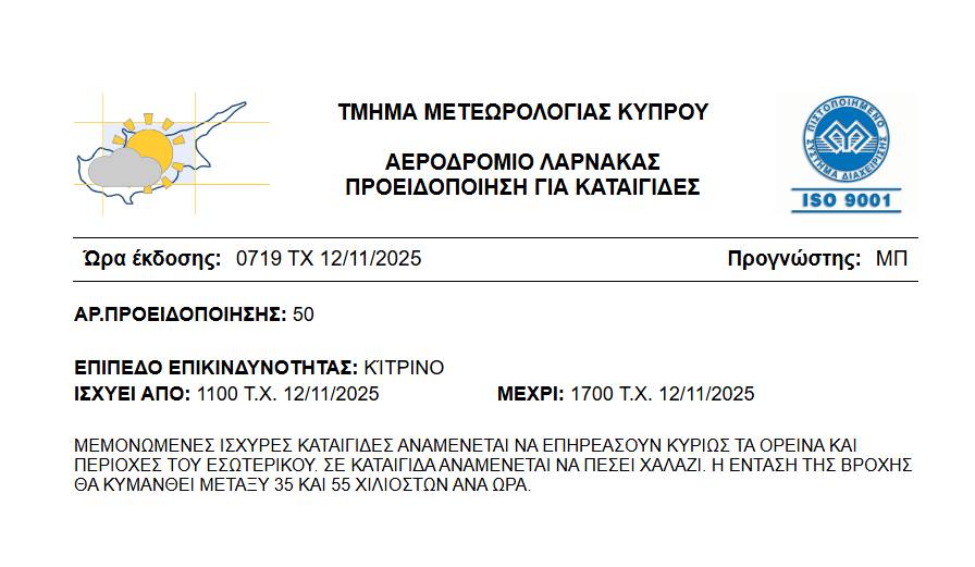 Έχει εκδοθεί Κίτρινη Προειδοποίηση για μεμονωμένες ισχυρές καταιγίδες, που αναμένεται να επηρεάσουν κυρίως τα ορεινά και εσωτερικά τμήματα του νησιού.
