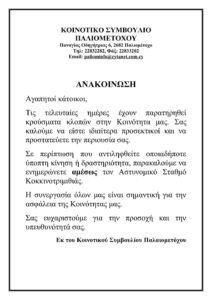 Τις τελευταίες ημέρες έχουν παρατηρηθεί κρούσματα κλοπών στην Κοινότητά μας. Σας καλούμε να είστε ιδιαίτερα προσεκτικοί και να προστατεύετε την περιουσία σας.