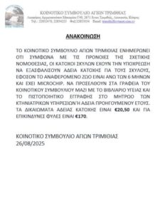 Το κοινοτικό συμβούλιο Αγίων Τριμιθιάς ενημερώνει ότι σύμφωνα με τις πρόνοιες της σχετικής νομοθεσίας, οι κάτοχοι σκύλων έχουν την υποχρέωση να εξασφαλίσουν άδεια κατοχής για τους σκύλους, εφόσον το αναφερόμενο ζώο είναι άνω των 6 μηνών και έχει microchip. να προσέλθουν στα γραφεία του κοινοτικού συμβουλίου μαζί με το βιβλιάριο υγείας και το πιστοποιητικό εγγραφής στο μητρώο των κτηνιατρικών υπηρεσιών ή άδεια προηγούμενου έτους.