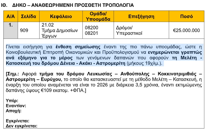 «Γίνεται εισήγηση για ένθεση σημείωσης έναντι της πιο πάνω υποομάδας, ώστε προτού διενεργηθεί οποιαδήποτε δαπάνη για το μέρος που αφορά τη Μελέτη – Κατασκευή του δρόμου Δένεια – Ακάκι – Αστρομερίτη (μήκους 19χλμ.), να ενημερώνεται η Κοινοβουλευτική Επιτροπή Οικονομικών και Προϋπολογισμού και να εξασφαλίζεται η γραπτή συγκατάθεσή της».