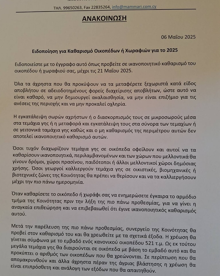 Το Κοινοτικό Συμβούλιο Μάμμαρι καλεί όλους τους ιδιοκτήτες οικοπέδων και χωραφιών να προβούν σε καθαρισμό των τεμαχίων τους μέχρι και τις 21 Μαΐου 2025, σύμφωνα με επίσημη ανακοίνωση που εκδόθηκε στις 6 Μαΐου.
