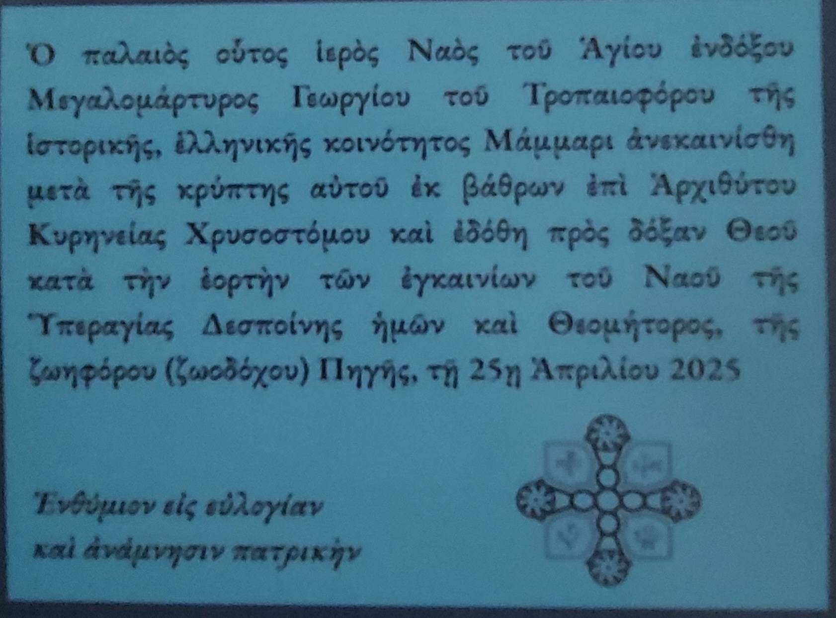 Με την ολοκλήρωση της εκ βάθρων ανακαίνισης του παλαιού Ιερού Ναού του Αγίου Γεωργίου Μάμμαρι και της κρύπτης του, η οποία βρίσκεται κάτω από το Ιερό Βήμα, τελέστηκε Αρχιερατικός Εσπερινός και η έκπλυση της Αγίας Τράπεζας από τον Πανιερώτατο Μητροπολίτη Κυρηνείας κ.κ. Χρυσόστομο, την Πέμπτη της Διακαινησίμου, 24 Απριλίου 2025.