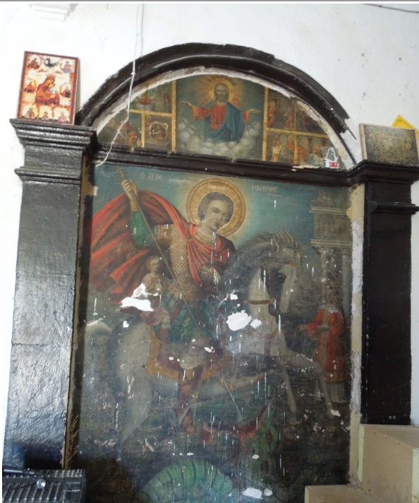 Από τον εσωτερικό διάκοσμό της διατηρείται σε πολύ κατάσταση η τοιχογραφία του αγίου Γεωργίου δρακοντοκτόνου με σκηνές του βίου του των αρχών του 20ού αιώνα. Η τοιχογραφία ιστορήθηκε από τους ζωγράφους ιερομόναχο Φώτιο και Παγκράτιο με την τεχνική της ελαιογραφίας.