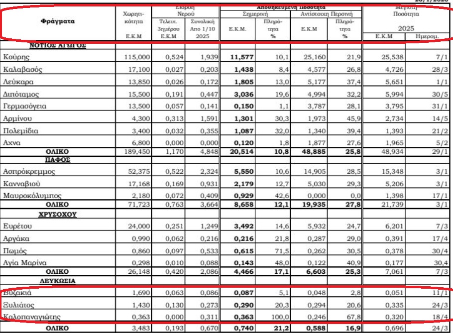Η κ. Οικονομίδου ανέφερε ότι το τελευταίο τριήμερο καταγράφηκε συνολική εισροή στα φράγματα περί τα 2,4 εκατομμύρια κυβικά μέτρα νερού, εκ των οποίων το 1,2 εκατ. κυβικά μέτρα νερού στα φράγματα της επαρχίας Πάφου. Πρόσθεσε ότι κατά την 26η Ιανουαρίου η συνολική αποθηκευμένη ποσότητα νερού στα φράγματα είναι 34 εκ. κυβικά μέτρα που αντιστοιχεί σε πληρότητα 11,8%, σε σύγκριση με 26,1% που ήταν το νερό στα φράγματα πέρσι την ίδια ημέρα. Η δυναμικότητα των φραγμάτων ανέρχεται στα 335 εκ. κυβικά μέτρα νερού, πρόσθεσε.