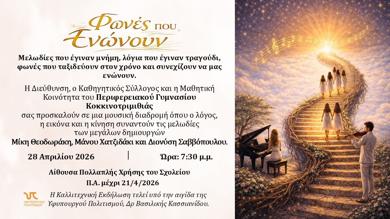 Το Περιφερειακό Γυμνάσιο Κοκκινοτριμιθιάς με ιδιαίτερη χαρά σας προσκαλεί σε μια μουσικοποιητική διαδρομή την Τρίτη 28/04/2026 και ώρα 7:30 μ.μ. στην αίθουσα πολλαπλής χρήσης του σχολείου.