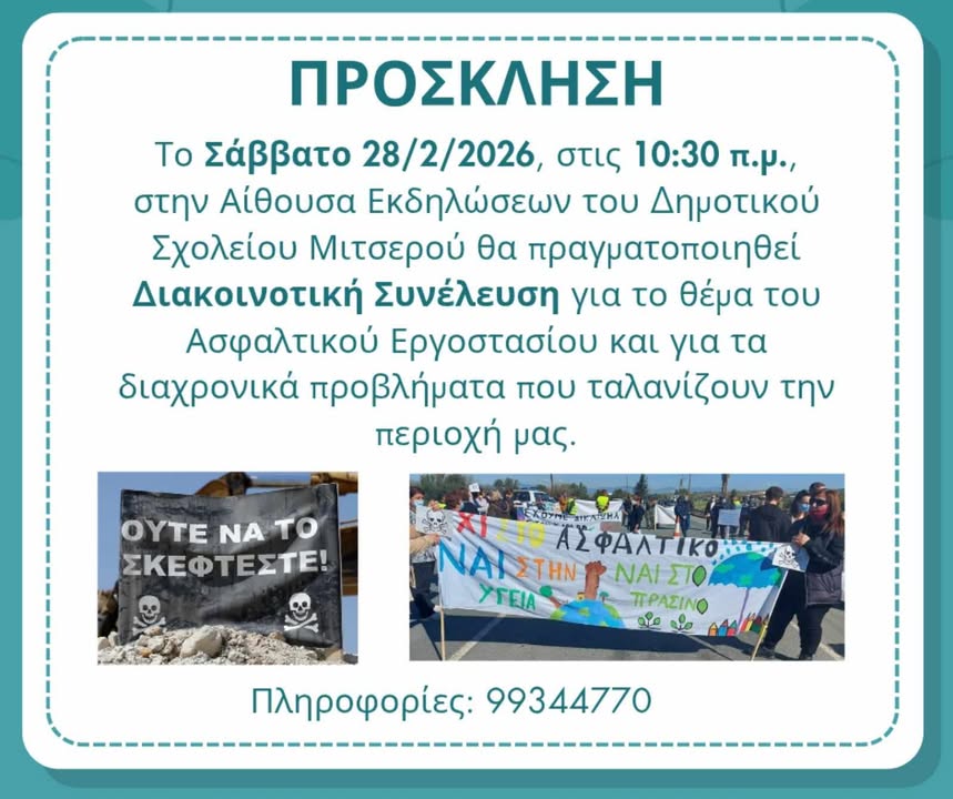 Θέμα της συνέλευσης είναι η ενημέρωση των επηρεαζόμενων κατοίκων και των αρμοδίων φορέων για τις πρόσφατες δικαστικές εξελίξεις σχετικά με το ζήτημα της εγκατάστασης Ασφαλτικού Εργοστασίου στην περιοχή. Παράλληλα, θα τεθούν προς συζήτηση τα διαχρονικά και συσσωρευμένα προβλήματα που αντιμετωπίζουν οι κοινότητες, τα οποία επηρεάζουν αρνητικά την ποιότητα ζωής, τη δημόσια υγεία και το περιβάλλον.