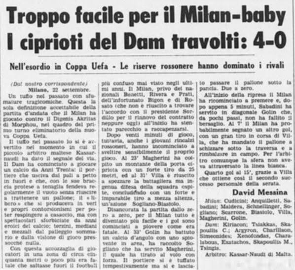 Όπως αναφέρεται στην ανάρτηση του σωματείου, “ως δευτεραθλητής Κύπρου ο Διγενής θα κληθεί να αντιμετωπίσει για το Κύπελλο UEFA την πανίσχυρη Μίλαν στην Τεργέστη της Ιταλίας από την οποία θα χάσει με 3-0. Ο αγώνας αποτελεί τον επαναληπτικό του αγώνα που διεξήχθη μια βδομάδα πριν στο θρυλικό Σαν Σίρο του Μιλάνου (σκορ 4-0).