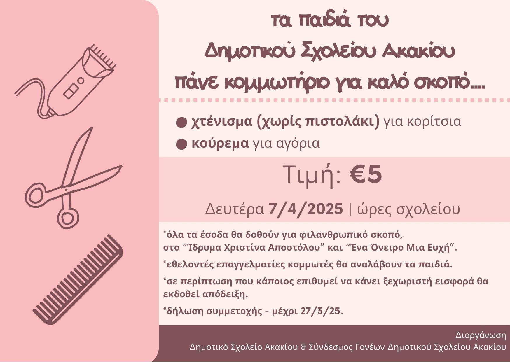 Μια συγκινητική τελετή πραγματοποιήθηκε την Τρίτη 20 Μαΐου, στα γραφεία του Συνδέσμου «Ένα Όνειρο μια Ευχή», όπου ο πρόεδρος του Συνδέσμου Γονέων του Δημοτικού Σχολείου Ακακίου παρέδωσε τα έσοδα από τη δράση «Τα παιδιά του Δημοτικού Ακακίου πάνε κομμωτήριο».