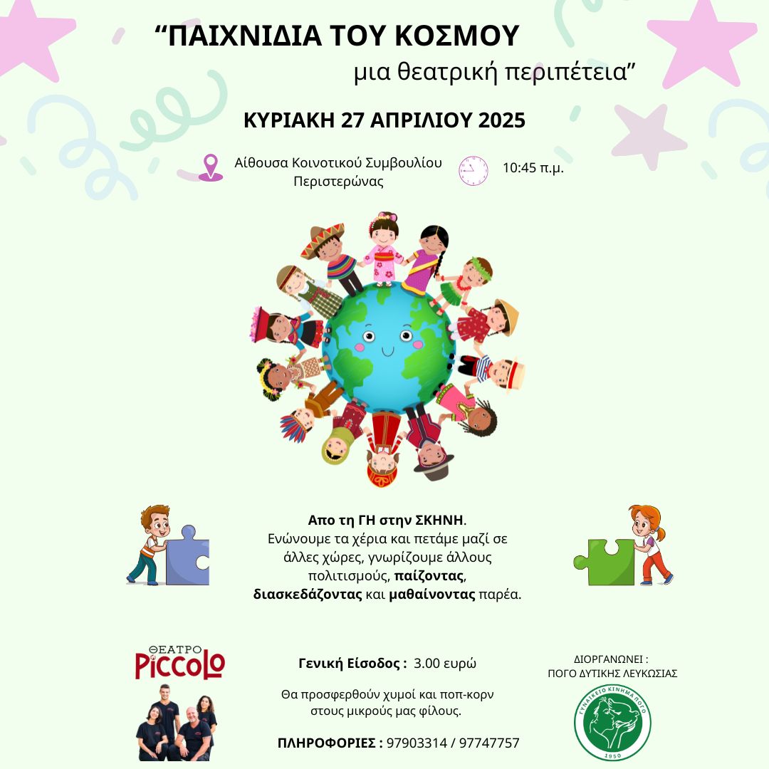 Η παιδική διαδραστική παράσταση “Παιχνίδια του Κόσμου”, από το καταξιωμένο Θέατρο Piccolo, θα παρουσιαστεί την Κυριακή 27 Απριλίου 2025, στις 10:45 π.μ., στην Αίθουσα Κοινοτικού Συμβουλίου Περιστερώνας.