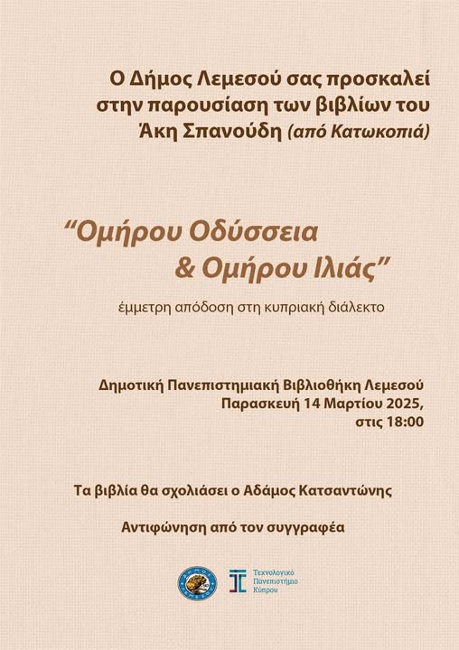 Ο Δήμος Λεμεσού διοργανώνει την παρουσίαση των βιβλίων του Άκη Σπανούδη Ομήρου Οδύσσεια & Ομήρου Ιλιάς, τα οποία αποδίδουν έμμετρα τα ομηρικά έπη στην κυπριακή διάλεκτο.