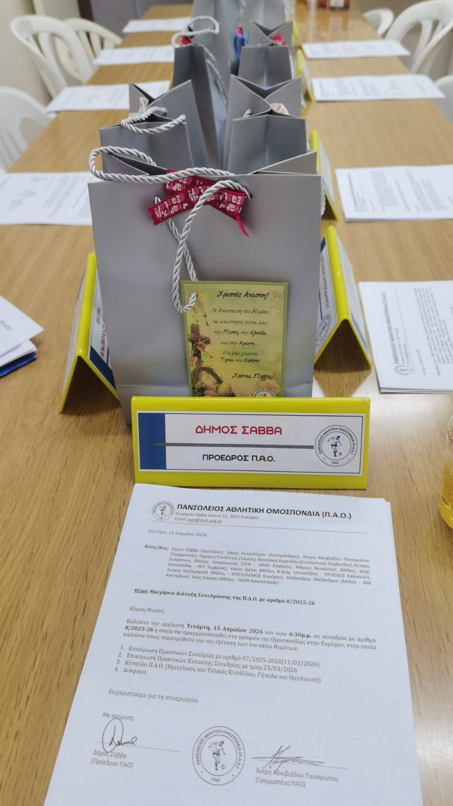 Στην εν λόγω συνεδρίαση ανταλλάχθησαν Πασχαλινές Ευχές μεταξύ των μελών της Ομοσπονδίας.