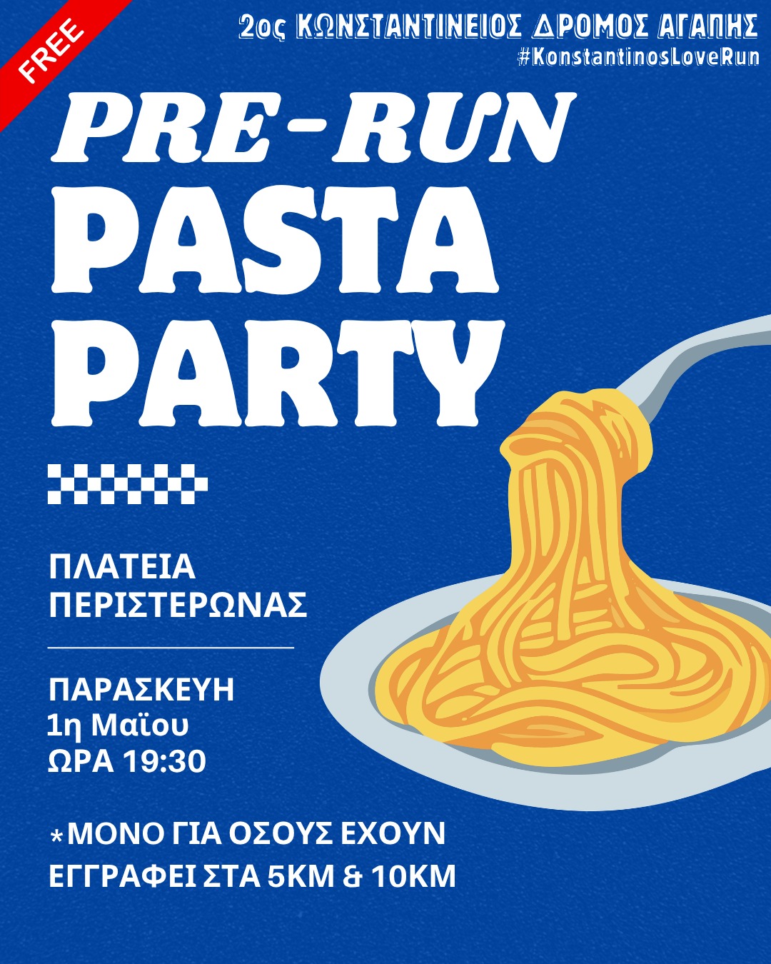 Οι διοργανωτές προσκαλούν τους συμμετέχοντες σε ένα pre-run pasta party στην Πλατεία Περιστερώνας, με δωρεάν μακαρόνια για όσους έχουν εγγραφεί στις διαδρομές των 5 και 10 χιλιομέτρων.
